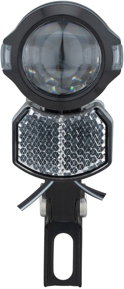 Spezifikationen:Ausführung:Frontlicht (weiß)Montage:Befestigung an der GabelkroneLeuchtmittel:1x LEDLeuchtkraft:35 LuxBetriebsmittel:NabendynamoTechnische Daten:Material:KunststoffStandlicht:Ja (4 min.)Schalter:Ein / Aus / Automatik (Sensor)Freigaben:Zulassung im Straßenverkehr:Ja, für Fahrräder nach §67 StVZOPrüfziffer:K~~1583Features:mit integriertem Frontrückstrahlergute Lichtverteilung dank Doppel-Linsen-Optikseitliche Sichtbarkeit durch zusätzliche FensterHerstellernummer:93944295SB